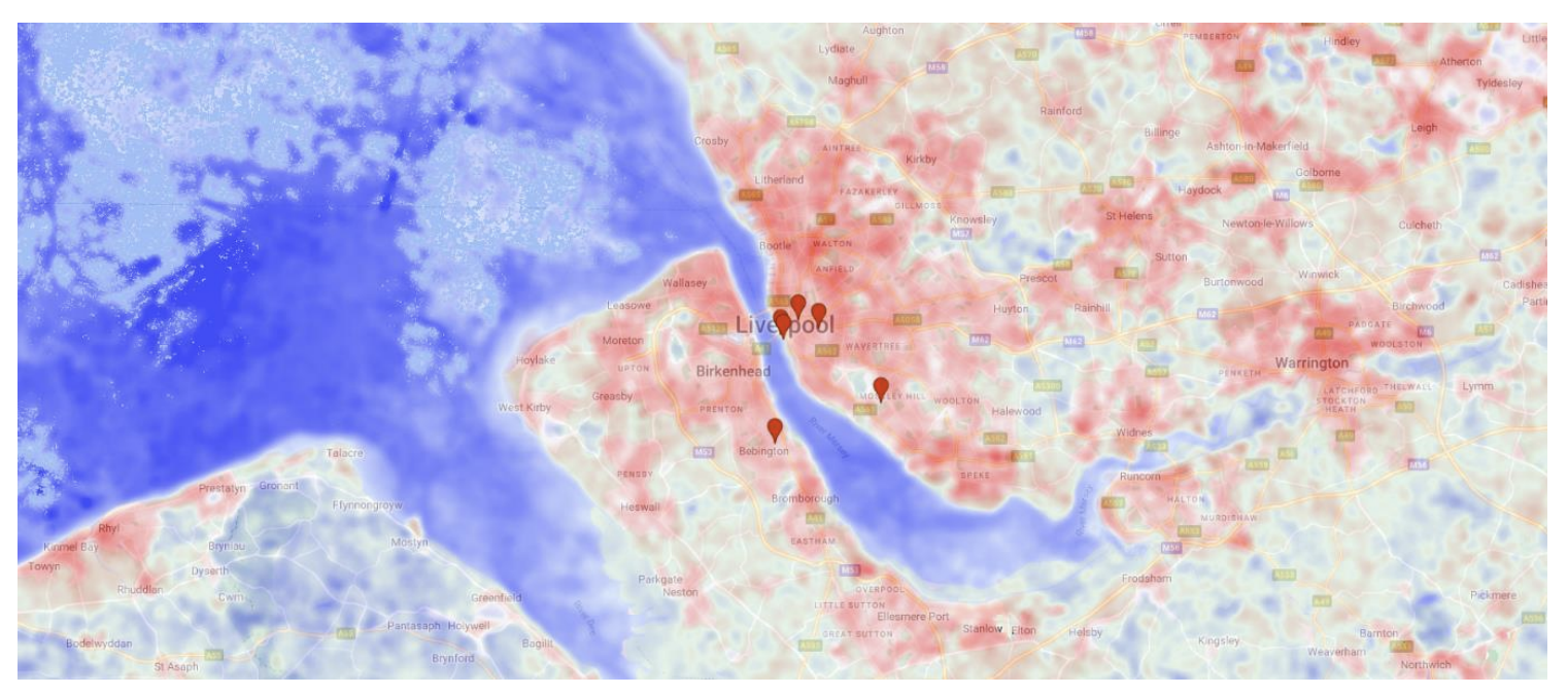 The waterfront sites — the Museum of Liverpool, the International Slavery Museum, and the Merseyside Maritime Museum — present the opposite picture: LST values of 25.86–26.97 °C and slightly negative UHI intensities. The Mersey is doing the work that vegetation does in greener cities.
