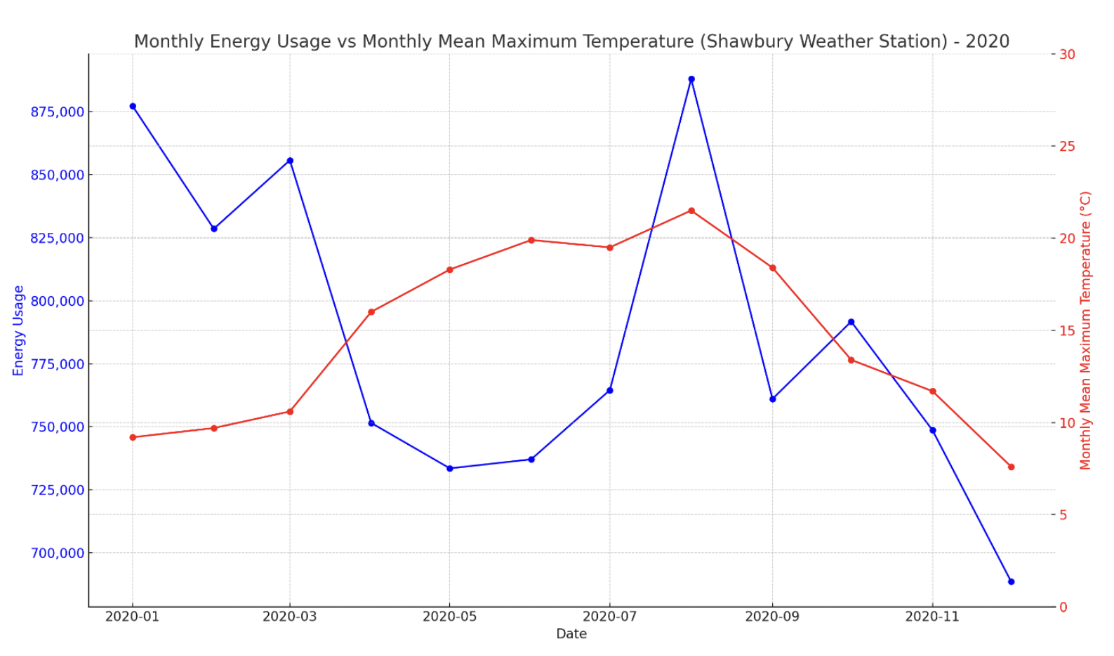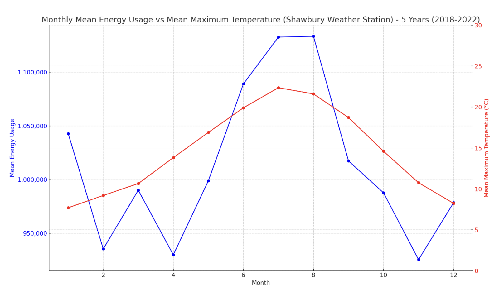 Aggregating NML’s monthly energy data for 2018–2022 against monthly Tmax from Shawbury produces a clean positive relationship: Pearson r = 0.73 across the full five-year window. Year-by-year, the coupling is even stronger in 2018 (r = 0.87) and consistently moderate-to-strong in 2019 (0.49), 2021 (0.59), and 2022 (0.55).