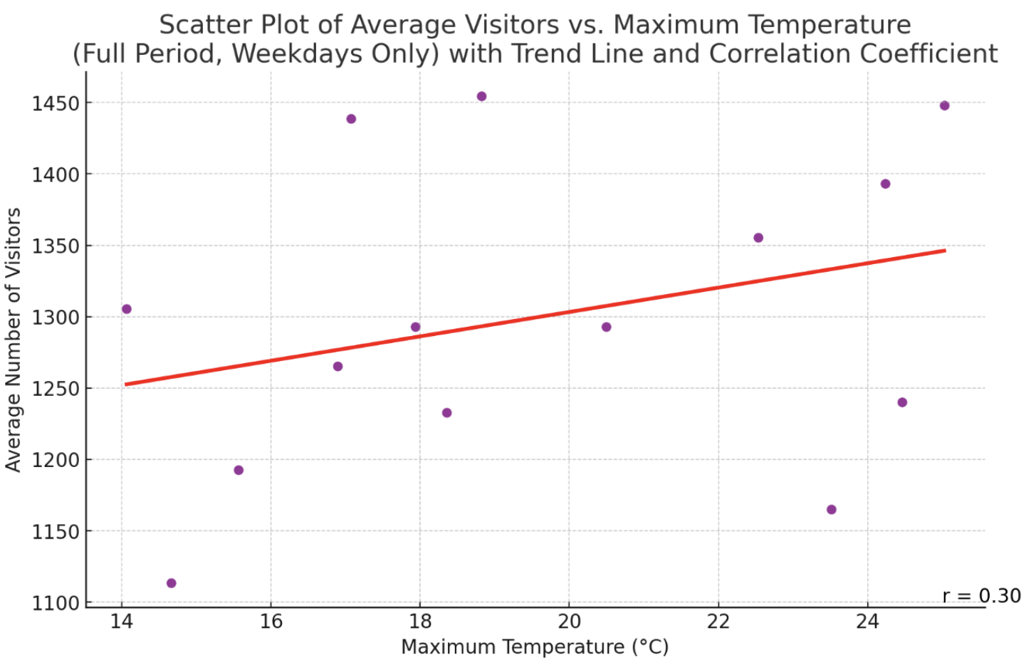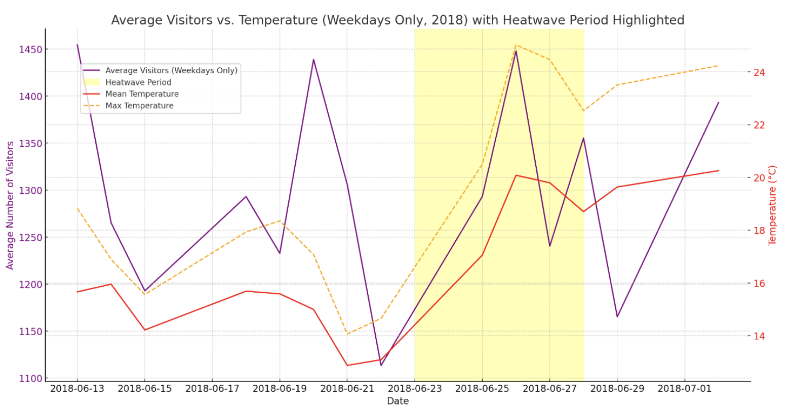 The visitor analysis is correlational, not causal. Daily visitor counts cannot distinguish “I came because it was hot” from “I came despite the heat for the exhibition opening.” Hourly entry data, or a survey of visitors during a heatwave, would let me actually test the cool-space hypothesis instead of inferring it from a weak positive correlation.